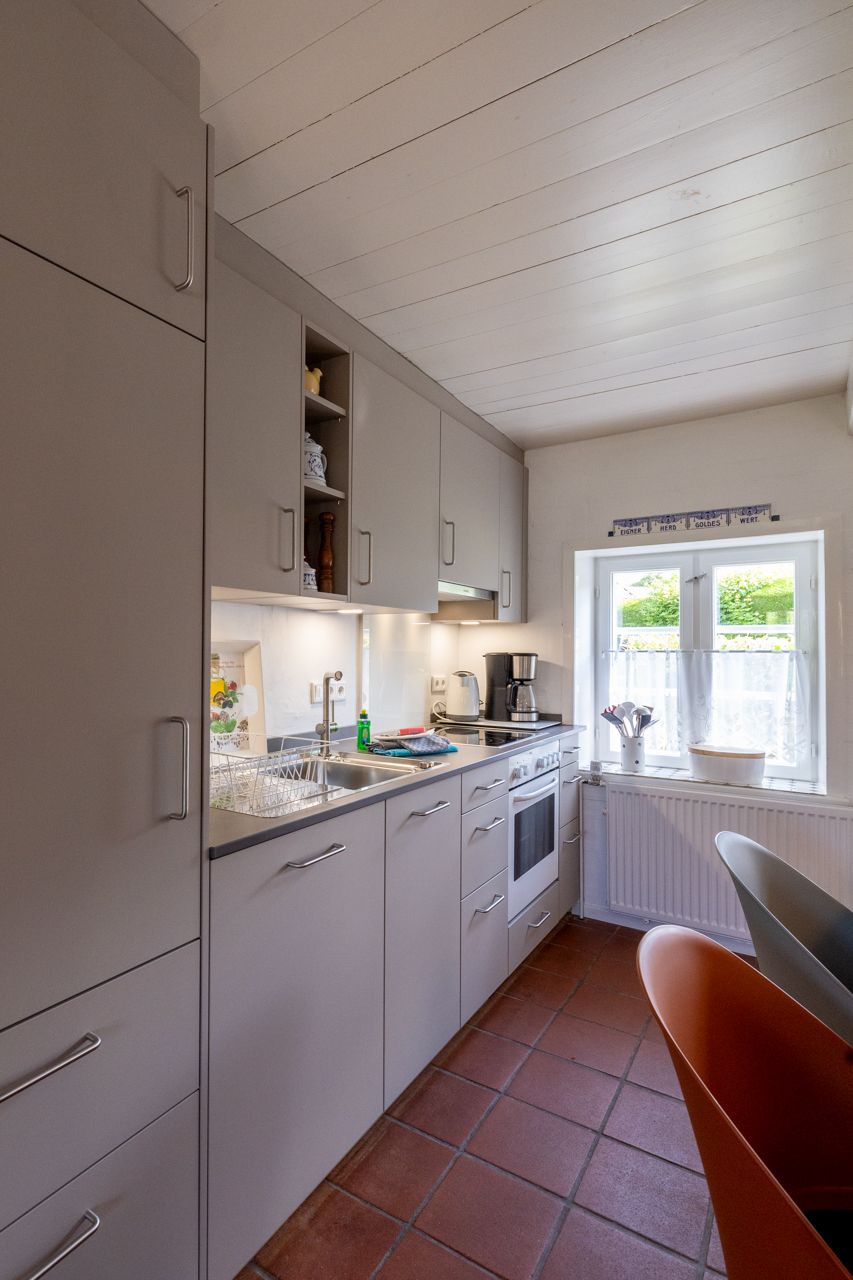 Die voll ausgestattete Küche ist ideal für Hobbyköche, die während des Urlaubs schmackhafte Gerichte zubereiten möchten. Es stehen Ihnen moderne Küchengeräte, wie ein Cerankochfeld, ein Backofen sowie eine Spülmaschine zur Verfügung. Die offenen Küchenutensilien und Gewürze sorgen dafür, dass Sie sich ganz entspannt ums Essen kümmern können. Der angrenzende Essbereich bietet ausreichend Platz für gemeinsame Mahlzeiten und gesellige Runden.