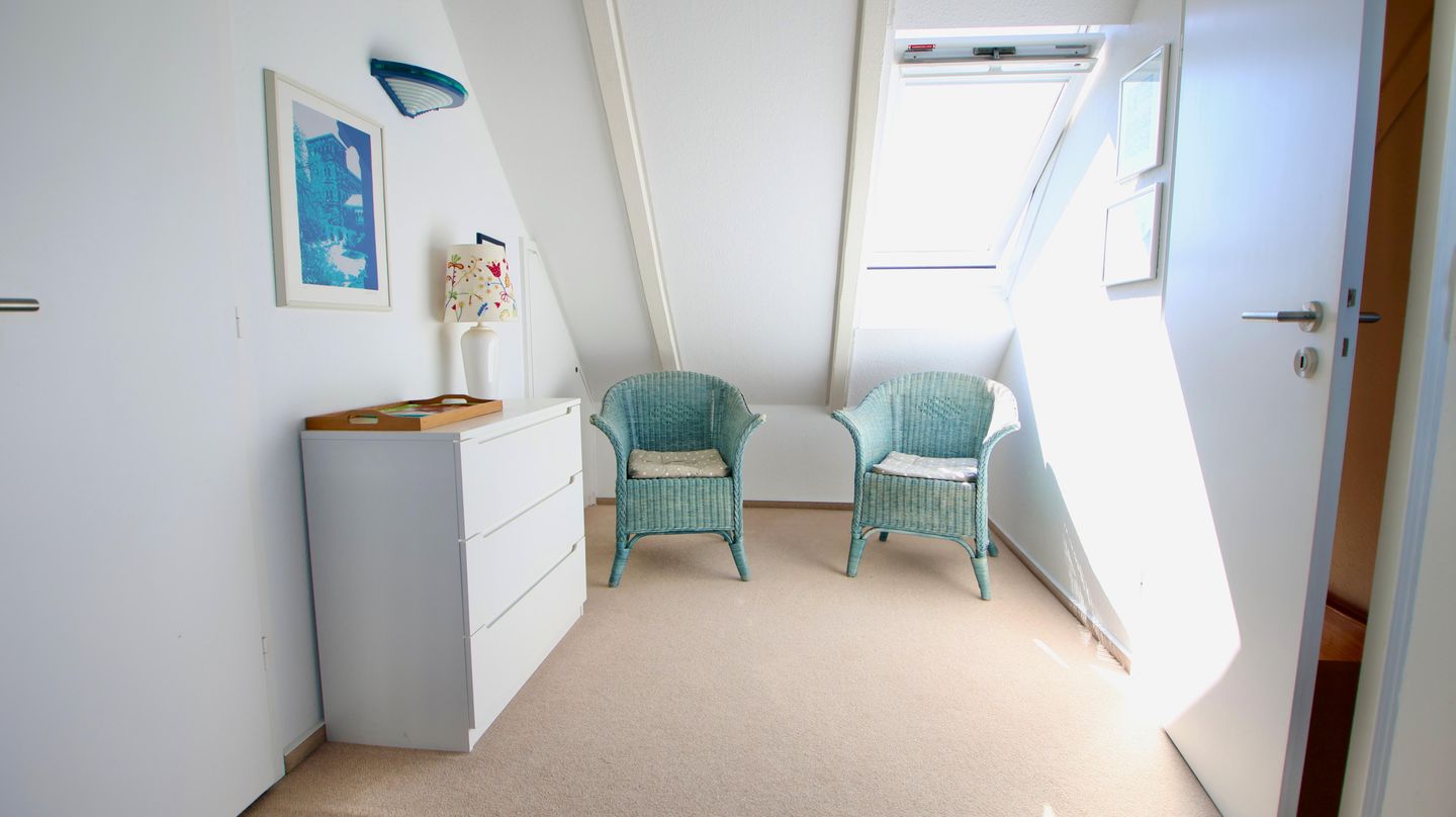 Helle 3-Zimmer-Ferienwohnung im Obergeschoss mit sonnigem Balkon. Die individuelle Wohnung verfügt über einen gemütlichen Wohn- Essbereich mit Zugang zur kleinen, aber gut ausgestatteten Küche. Der Balkon, der mit einer großen Markise versehen ist, erreichen Sie über den Wohn-Essbereich. Auf dieser Ebene befindet sich das Schlafzimmer mit zwei einzelnen Betten. Direkt daneben liegt das erste von zwei Duschbädern. Auf der 2. Ebene gibt es ein zusätzliches Schlafzimmer mit Doppelbett und bad-en-suite. Hervorzuheben ist der ausreichende Stauraum in beiden Schlafzimmern, der durch die Einbauschränke gegeben wird. Im Souterrain des Hauses finden Sie die kleine Sauna sowie das Schwimmbad. Den Sandstrand in Nieblum erreichen Sie in wenigen Gehminuten.