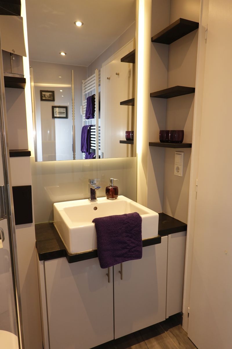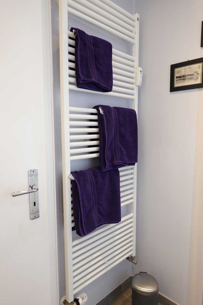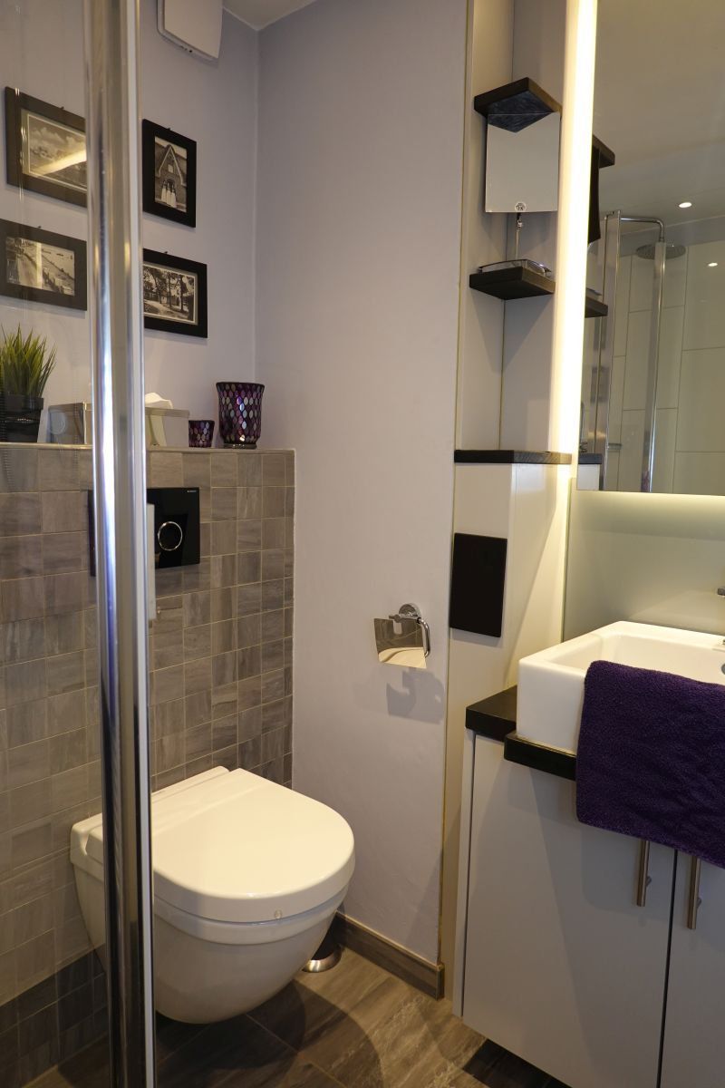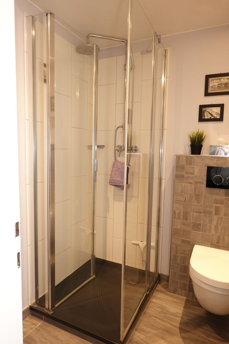 Das Badezimmer ist modern und praktisch gestaltet mit einer bodengleichen Dusche, WC, Waschbecken und einem Haartrockner. Zudem steht Ihnen die Möglichkeit zur Verfügung, die Gemeinschaftseinrichtungen wie Waschmaschine und Trockner in Anspruch zu nehmen.
