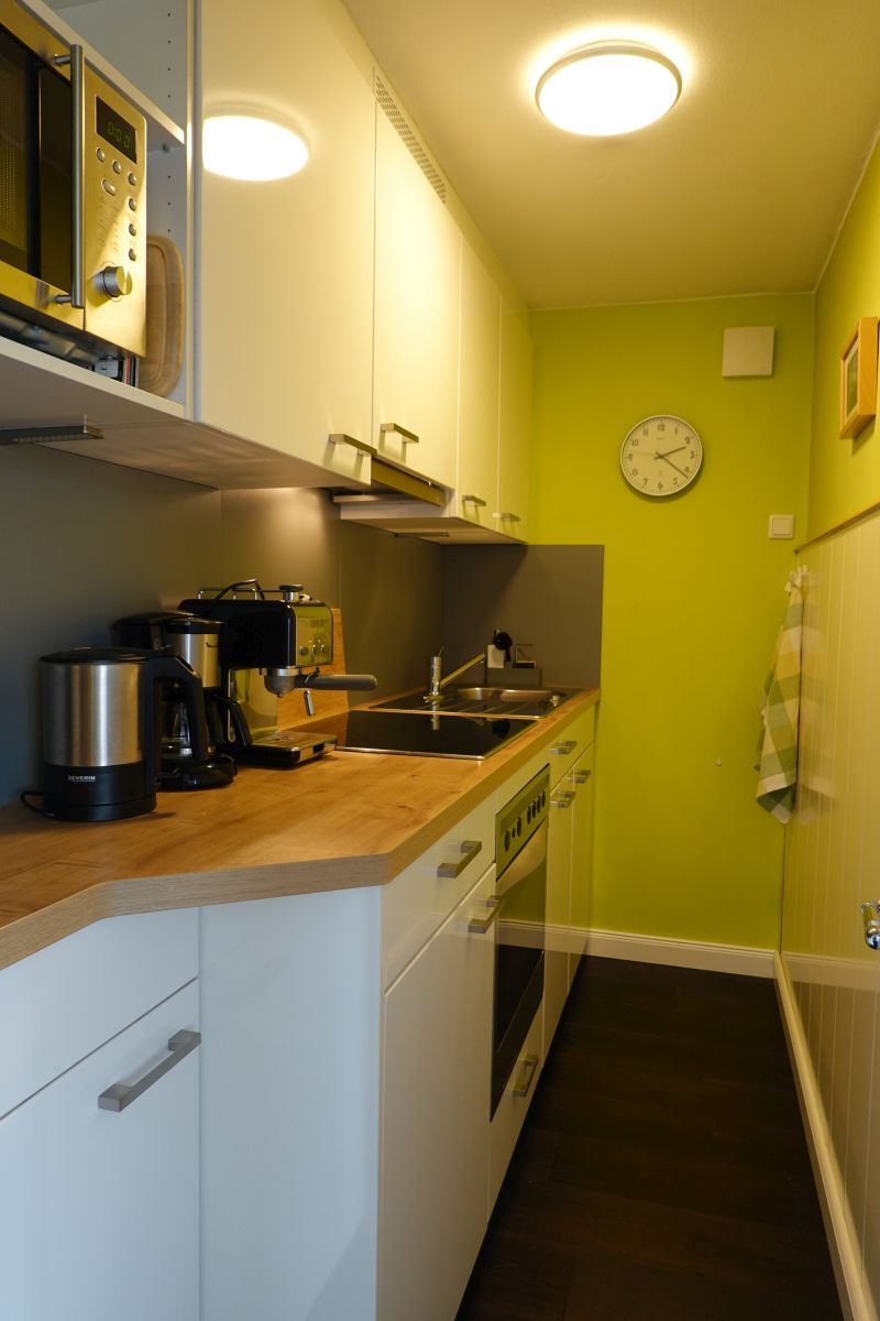 Die geschlossene Küche ist voll ausgestattet und lässt keine Wünsche offen. Sie verfügt über ein Cerankochfeld, einen Elektro-Backofen, eine Spülmaschine, einen Kühlschrank mit Gefrierfach und weitere nützliche Küchenutensilien wie Mikrowelle, Wasserkocher, Kaffeemaschine sowie Toaster. Ob Frühstück oder Dinner – hier zaubern Sie mühelos Ihre Lieblingsgerichte. Für Ihre Bequemlichkeit sind auch Bettwäsche, Handtücher und ein Erste-Ausstattung-Paket vorhanden.