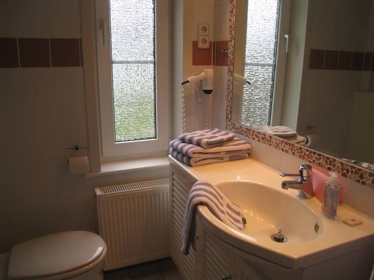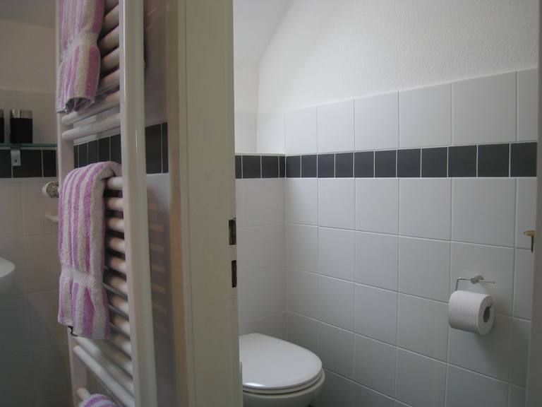Das Badezimmer ist mit einer bodengleichen Dusche, einem WC sowie einem Waschbecken ausgestattet. Zusätzlich gibt es ein Gäste-WC, das besonders für größere Gruppen von Vorteil ist. Die Wohnung ist auch mit einem Haartrockner sowie einer Erstausstattung an Handtüchern und Bettwäsche versehen, damit Sie sich sofort wohlfühlen können.