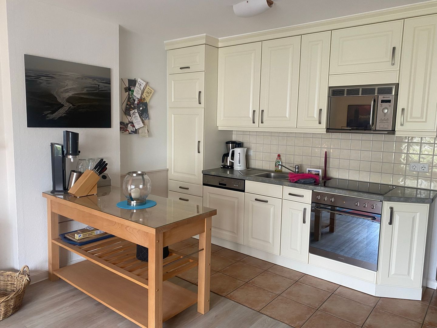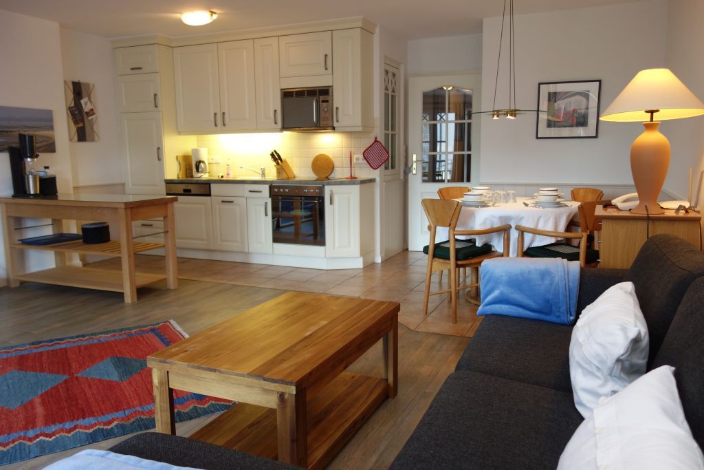 Die moderne offene Küche schließt sich nahtlos an das Wohnzimmer an und ist umfassend ausgestattet. Sie finden hier neben einem 4-Platten-Herd mit Elektroanschluss einen Backofen, eine Mikrowelle, Kühlschrank mit integriertem Gefrierfach, eine Spülmaschine sowie zahlreiche weitere Geräte wie Kaffeemaschine, Kaffee- und Teemaschine, Wasserkocher, Toaster und Mixer. Selbstverständlich sind auch Utensilien wie Abfalleimer, Reinigungsmittel und Wäscheständer vorhanden. Eine Erstausstattung an Bettwäsche, Handtüchern und Badetüchern wird bereitgestellt, sodass Sie komfortabel anreisen können.