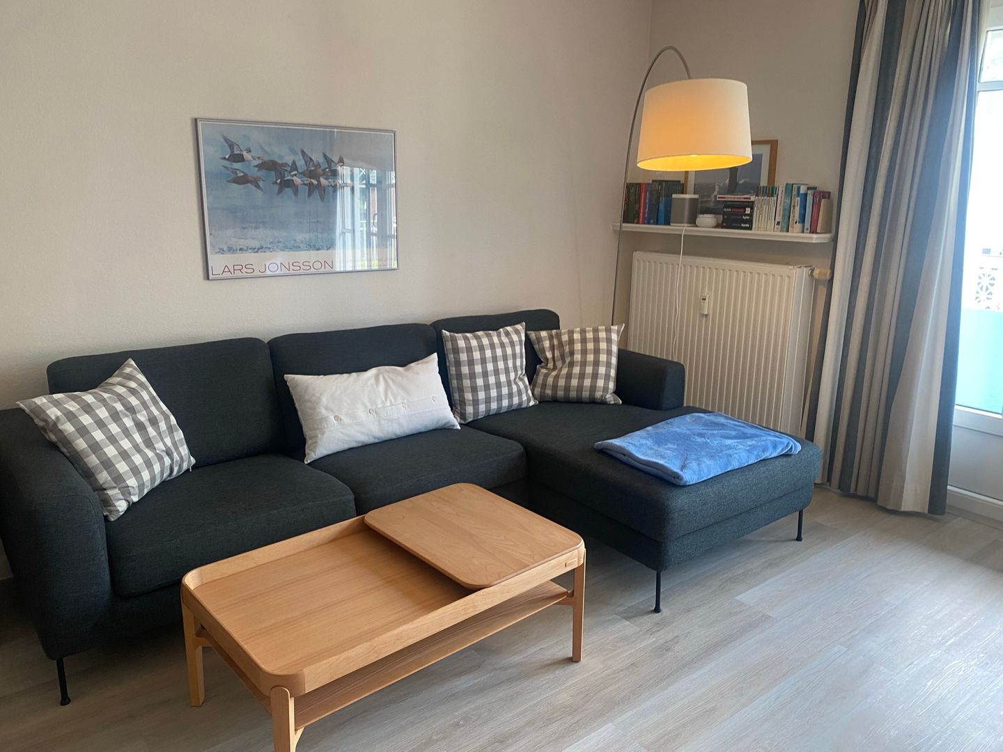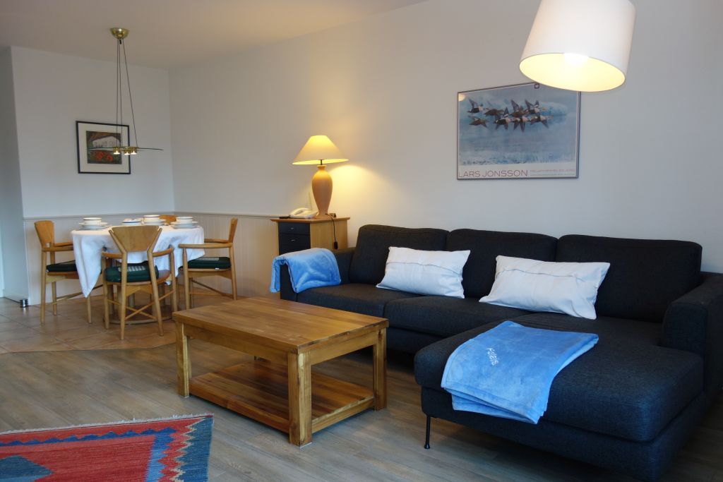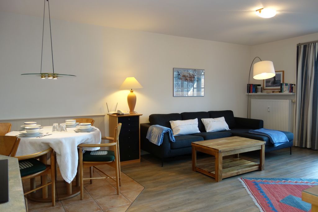 Mit insgesamt drei Zimmern, darunter zwei separate Schlafzimmer (ein Doppelbett 180x200 und ein Einbaubett 180x178), eignet sich die Wohnung optimal für Familien oder befreundete Paare mit bis zu vier Personen. Die Schlafräume sind stilvoll eingerichtet und sorgen für erholsame Nächte. Im offenen Wohnbereich lädt eine gemütliche Sofaecke zum gemeinsamen Entspannen ein. Ein zusätzlicher Sessel sowie eine Kommode vervollständigen den Bereich, der genügend Platz für alle Gäste bietet. Der angrenzende Essbereich mit Esstisch bietet Raum für gemeinsame Mahlzeiten.