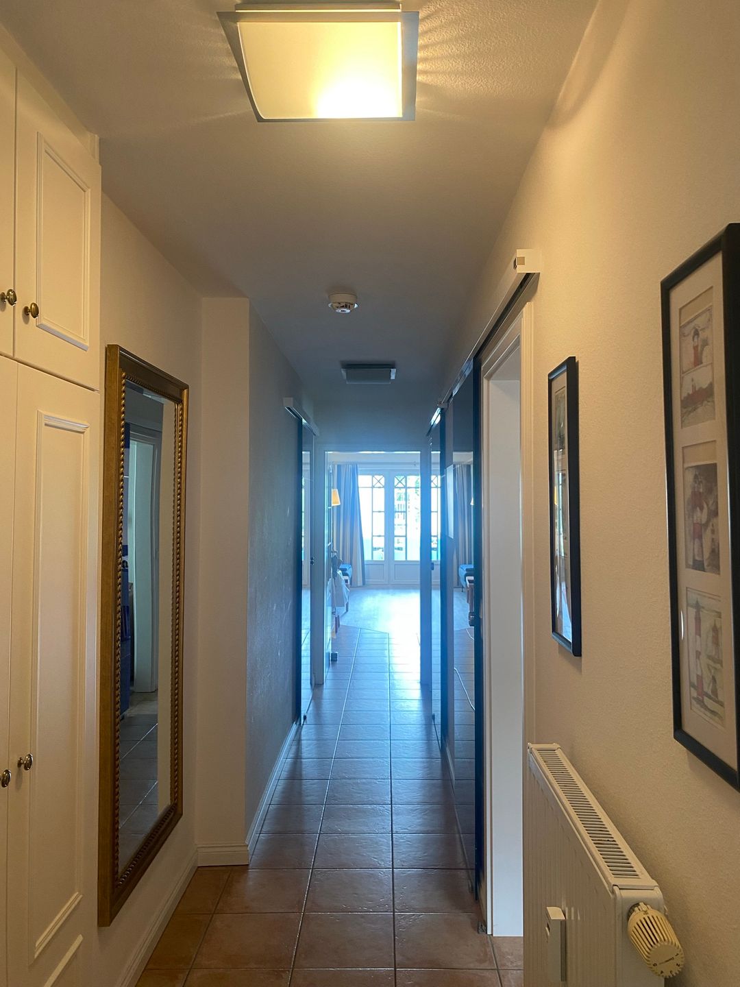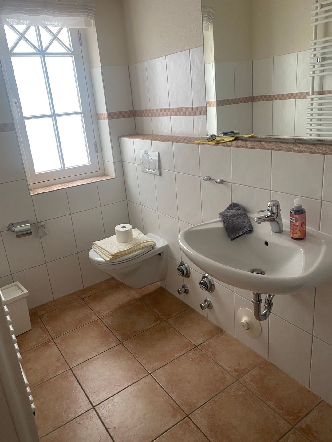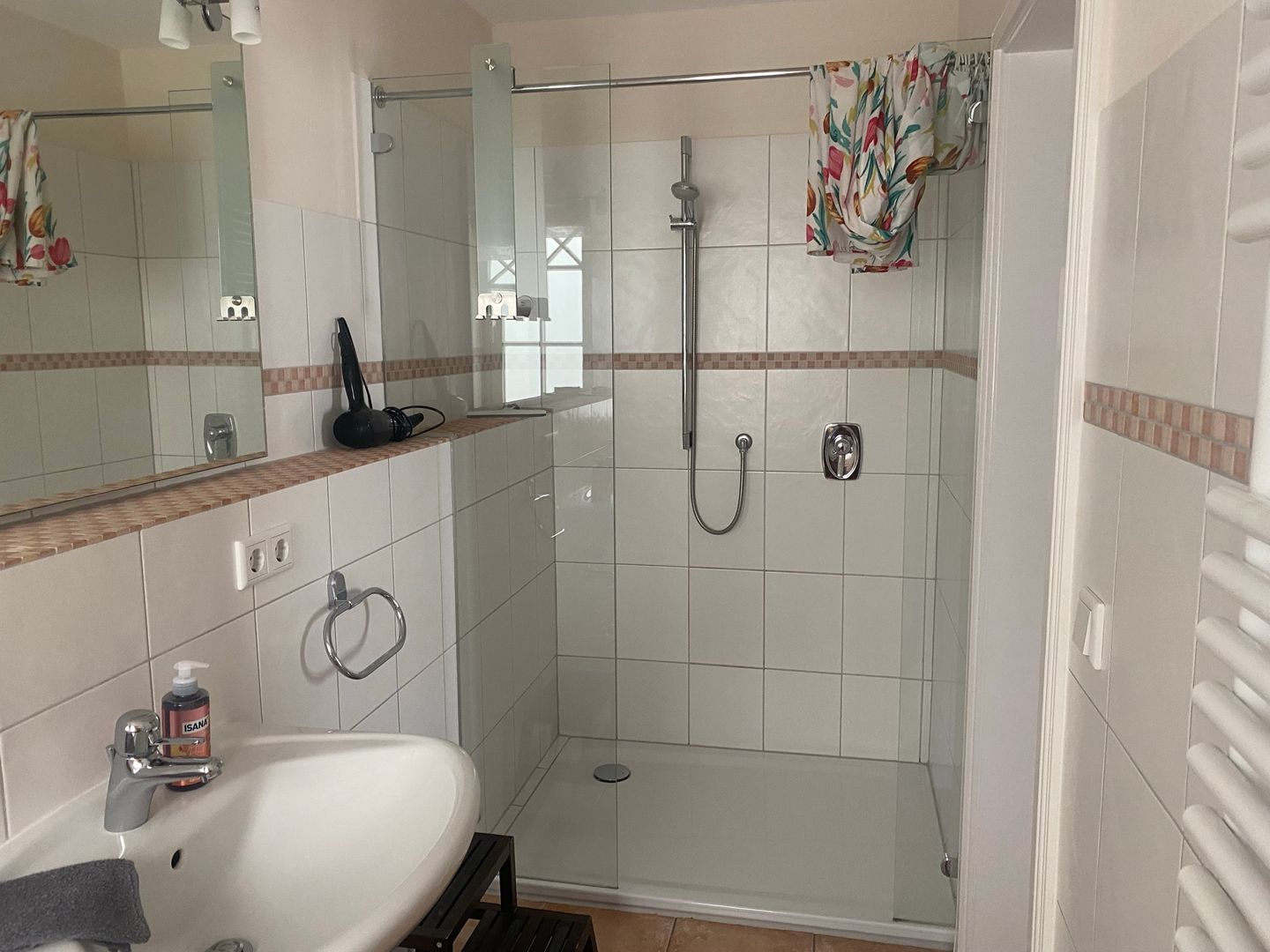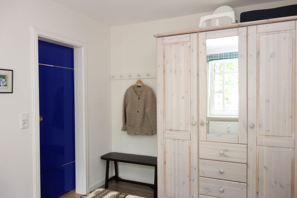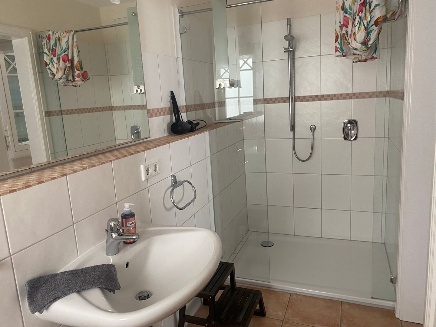 Das Badezimmer verfügt über eine bodengleiche Dusche, Waschbecken, Spiegel, WC und einen Haartrockner. Die barrierearme Duschmöglichkeit erhöht den Komfort zusätzlich. Ein Bügeleisen, Bügelbrett sowie Garderobe stehen für Ihren Aufenthalt zur Verfügung.