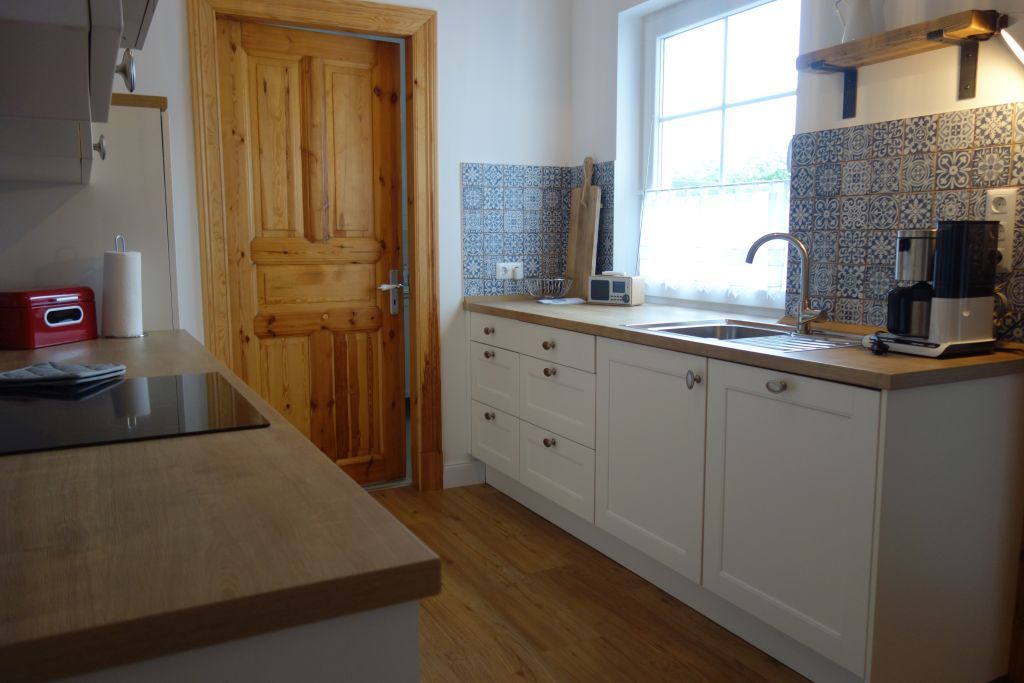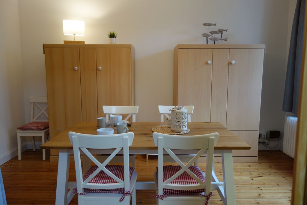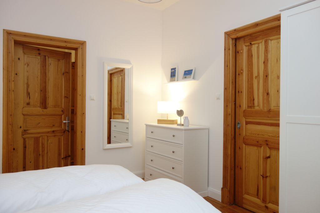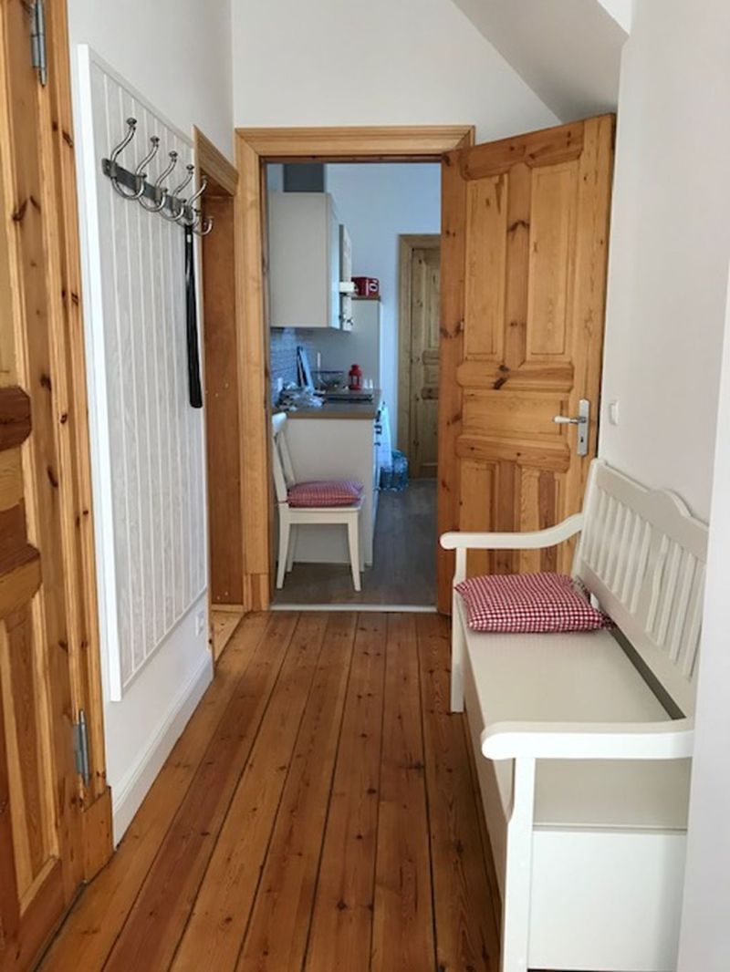 Die Villa bietet alles, was das Herz begehrt: Ein gemütliches Wohnzimmer lädt zum Entspannen ein, während das angrenzende Esszimmer nicht nur Platz für gemeinsame Mahlzeiten bietet, sondern mit zwei komfortablen Schrankbetten (je 110 cm breit) zusätzliche Schlafmöglichkeiten schafft. Das separate Schlafzimmer, die voll ausgestattete Küche und das freundliche Duschbad sind harmonisch in hellen Weiß- und Naturholztönen gestaltet und tragen zum lichtdurchfluteten Ambiente bei. Ein besonderes Highlight: Viele der originalen Zimmertüren konnten erhalten bleiben, wodurch der nostalgische Charme des Hauses bewahrt wurde. Die gelungene Mischung aus Alt und Neu macht die Villa Hansson zu einem ganz besonderen Rückzugsort.