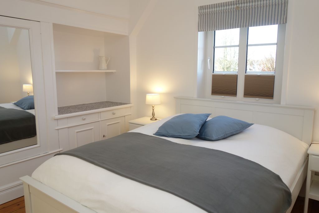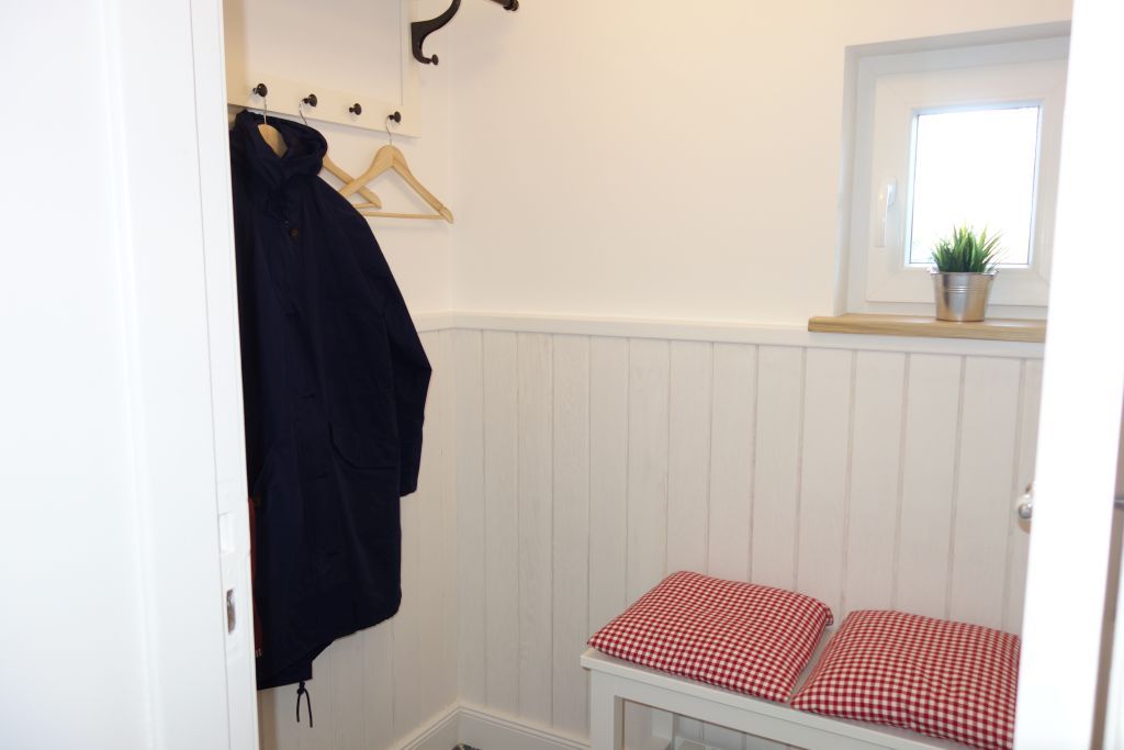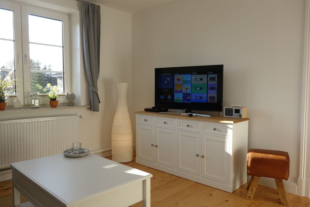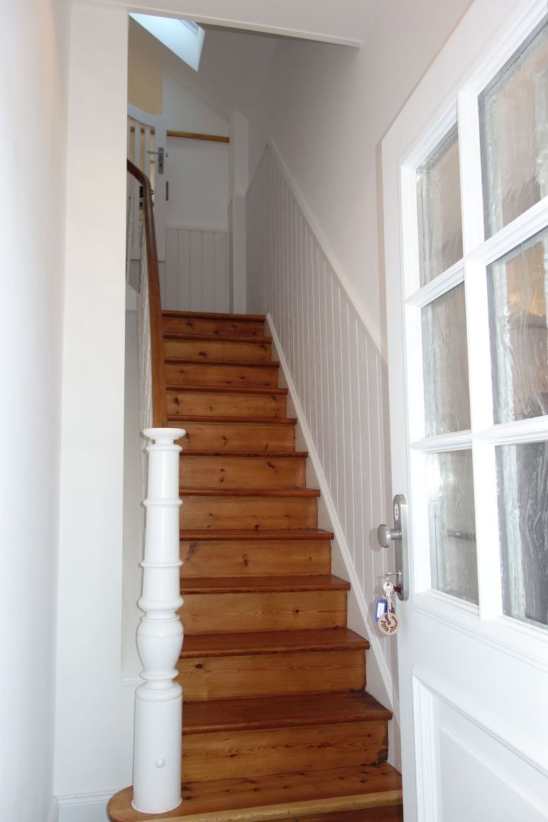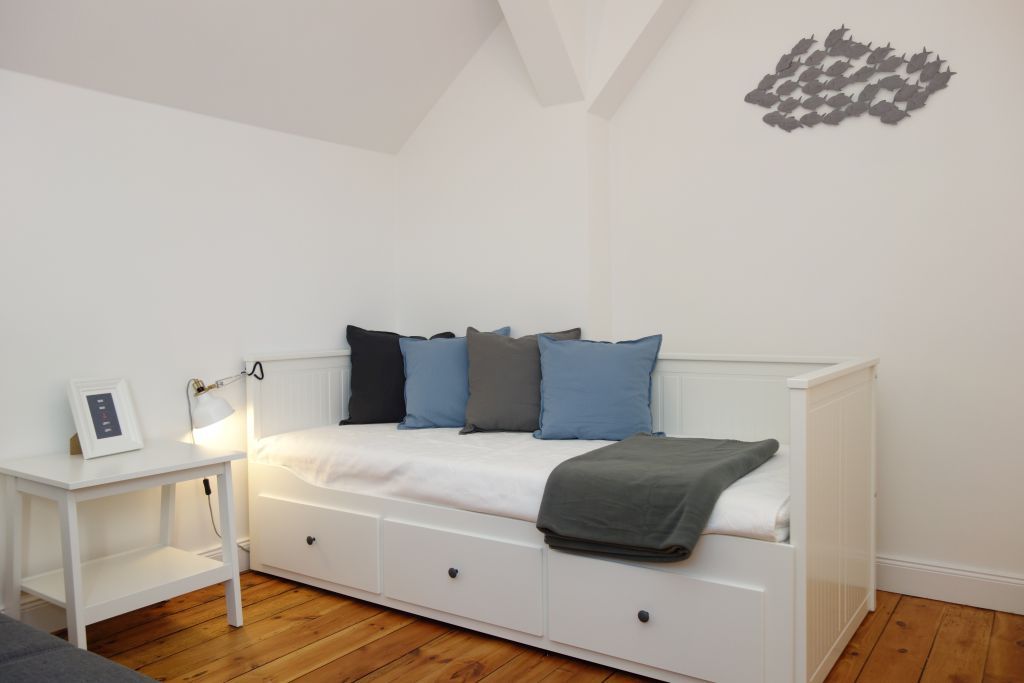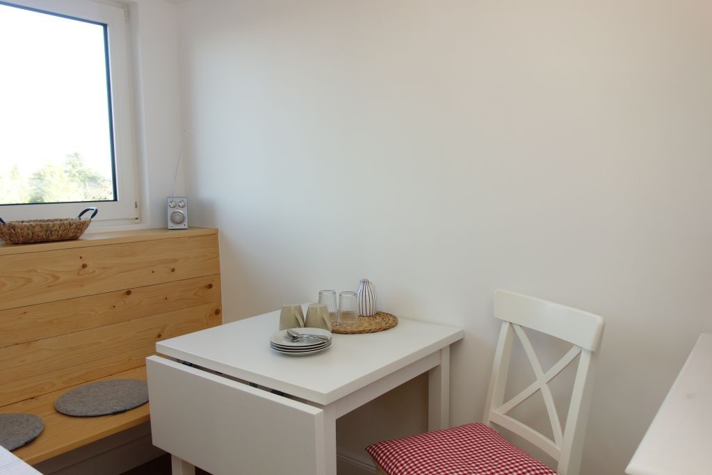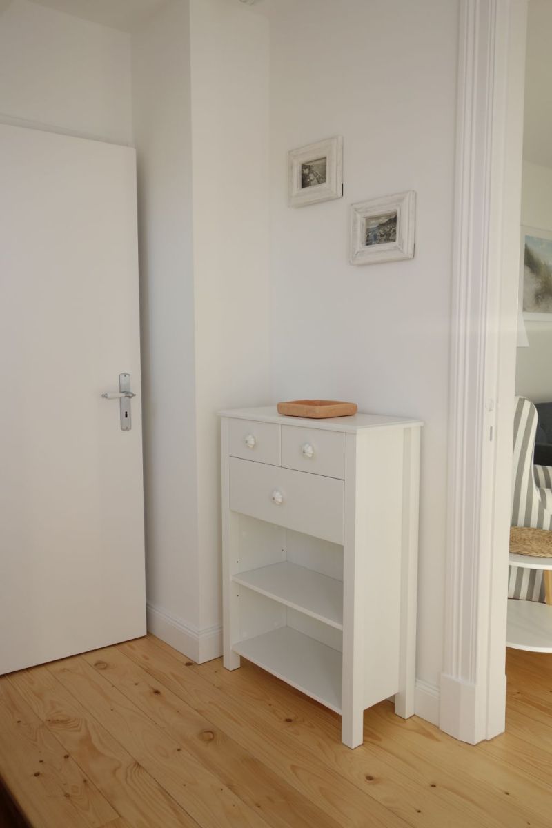 Die Villa beherbergt zwei Wohneinheiten, darunter die gemütliche Obergeschoss-Wohnung, die Platz für bis zu drei Personen bietet. Helle Farben, natürliche Materialien und eine stilvolle Einrichtung schaffen eine einladende Atmosphäre. Die Wohnung verfügt über ein komfortables Wohnzimmer, eine kompakte, aber gut ausgestattete Küche, zwei behagliche Schlafzimmer, ein großzügiges Duschbad und einen einladenden Flur.